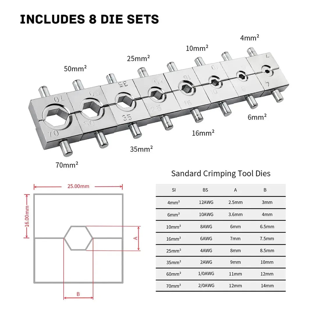- 8 डाई जोड़े (आकार: 4/6/10/16/25/35/50/70मिमी²)